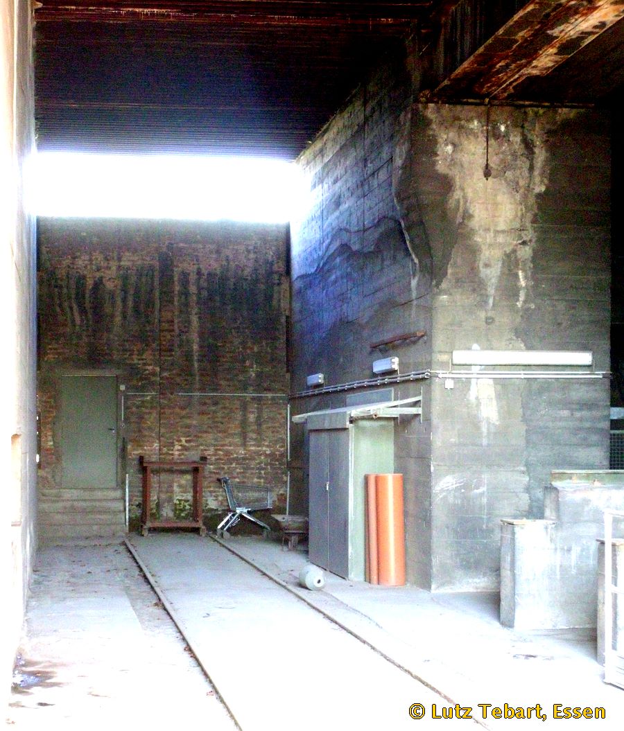 die Eisenbahnschienen gut zu erkennen. Auf der rechten Seite ist der Durchgang zum Material- und Werkzeuglager,