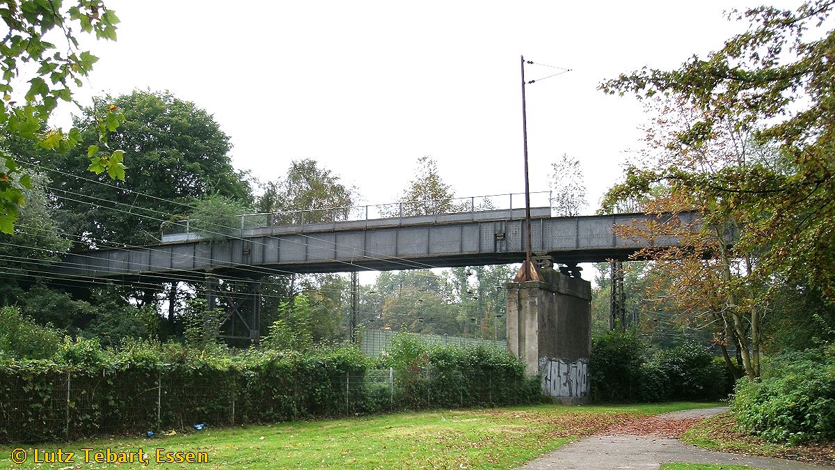 Links vom Schölerpad sieht die Eisenbahnbrücke des Gleises in Richtung Borbeck Bahnhof. Unter der Brücke