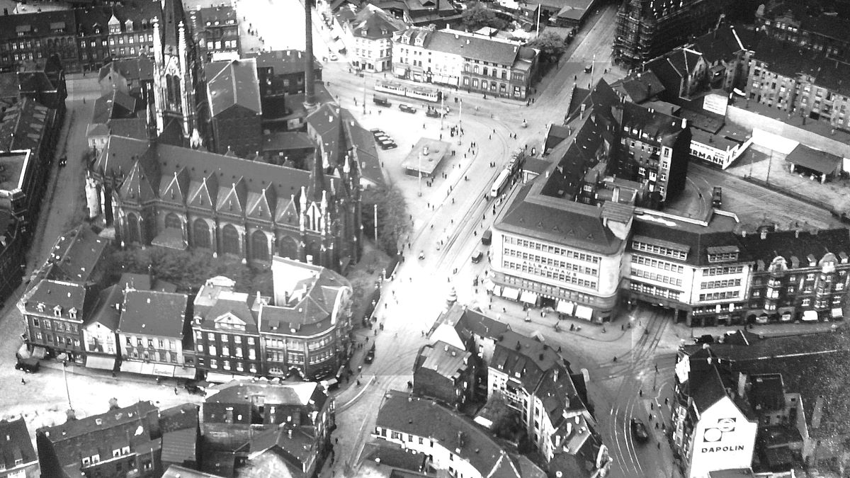 Das Gebäude mit der Durchfahrt und dem Pferdemarkt davor, die Kirche St. Gertrud und der Viehofer Platz sind noch heute