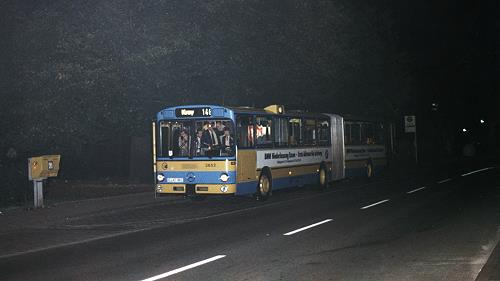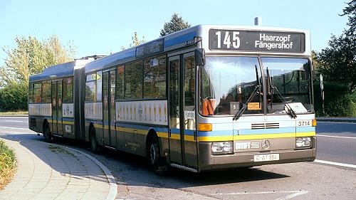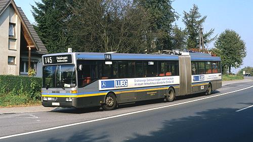 Der DUO-Bus 3714 der Essener Verkehrs-AG am 11. Oktober 1990 an der Endstelle Fängershof der Linie 145 in Haarzopf.