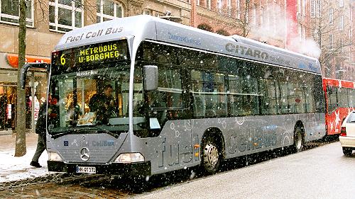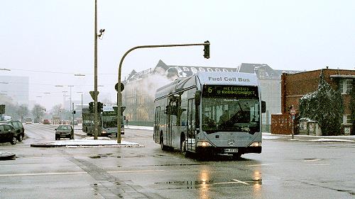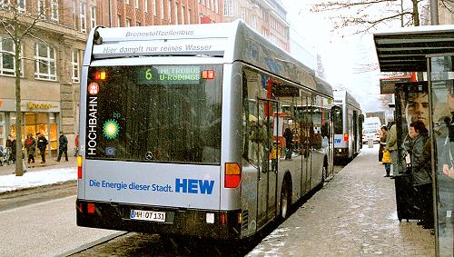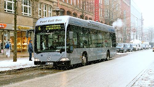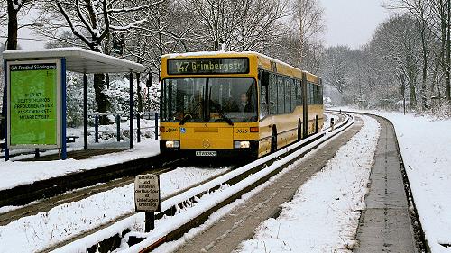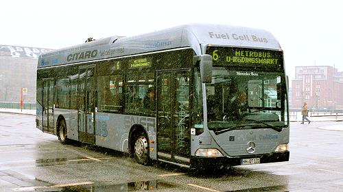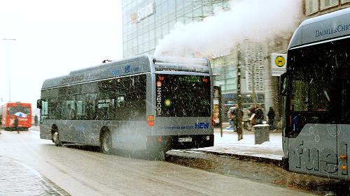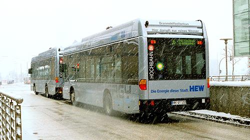 Zwei der drei Hamburger Brennstoffzellen-Citaros (O 530 BZ) auf der Metrobuslinie 6 im Hamburger Schneetreiben, in der Nähe