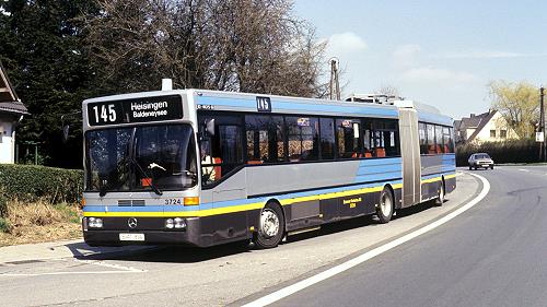 Der Essener DUO-Bus 3721 am 11. Oktober 1990 an der Endstelle Fängershof der Linie 145 in Haarzopf. Bis zum Bau der Spurbusstrecke